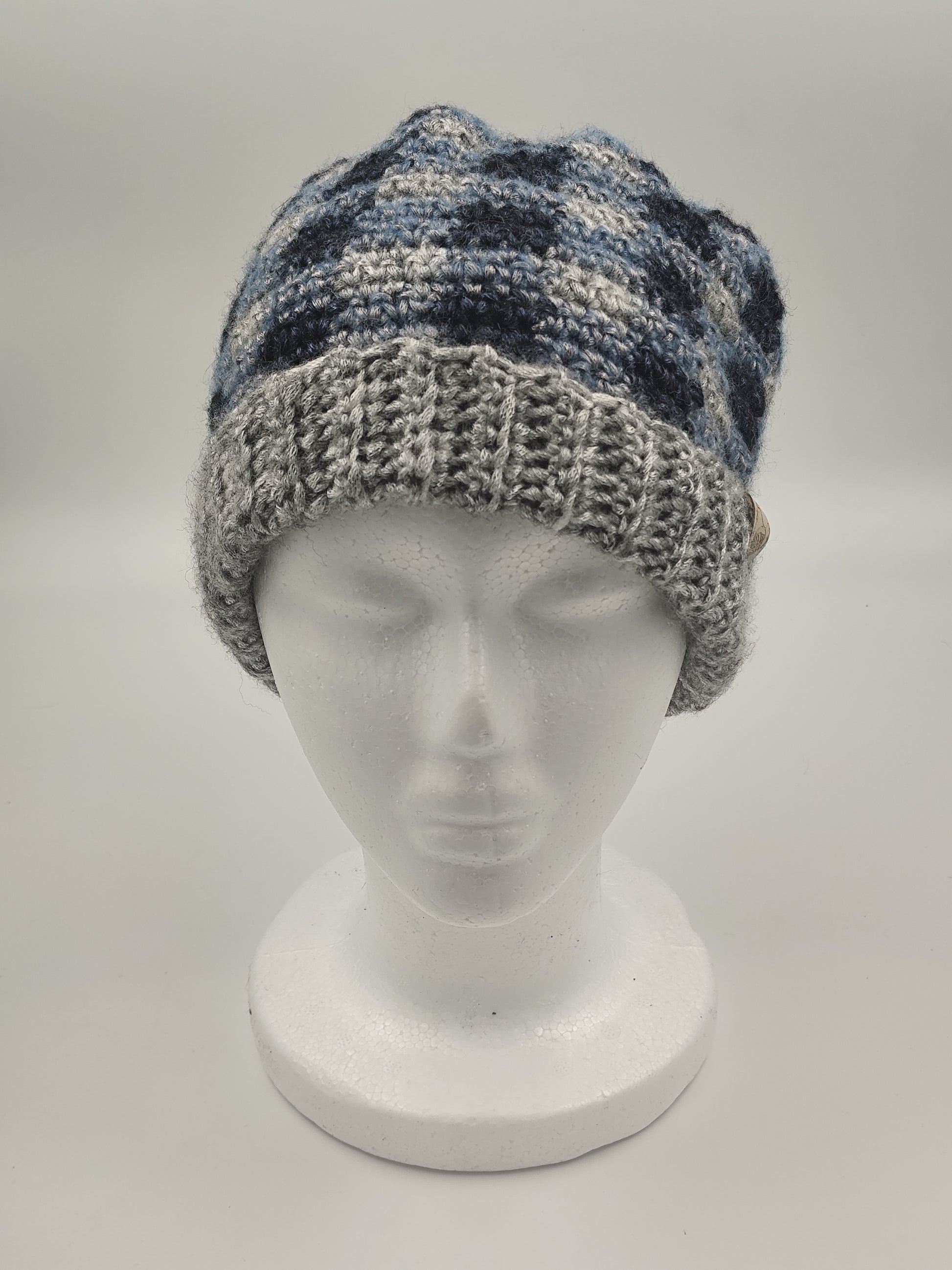 Crocheté à la main avec son effet métallisé et son coté chemise de bucheron , il garde la tête au chaud avec audace .