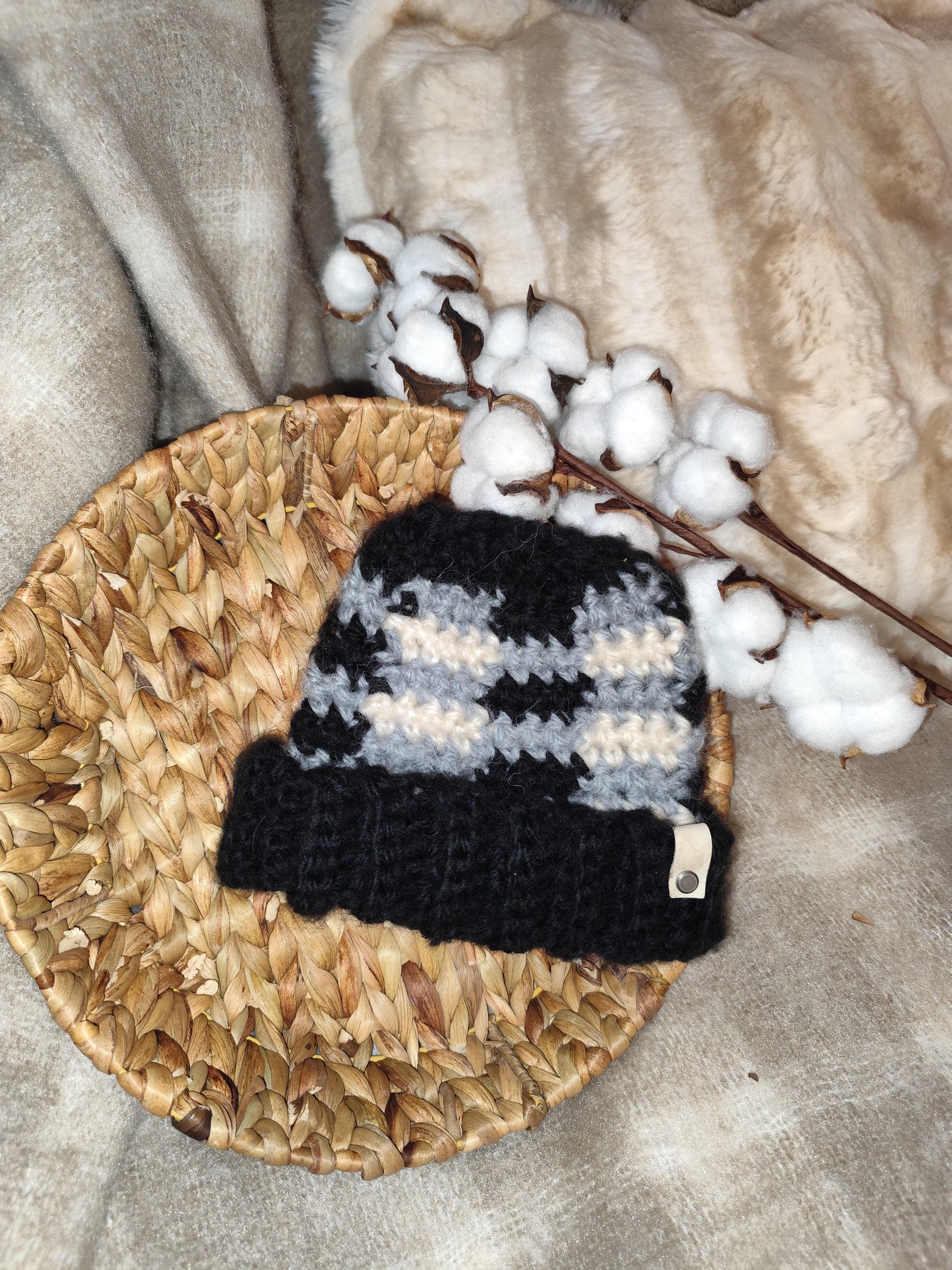 Bonnet crochet fait main Chantecler - Noir/souris/neige